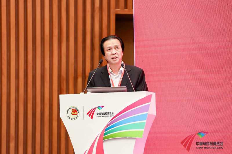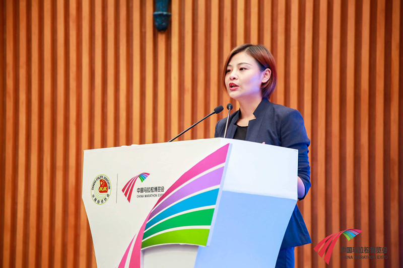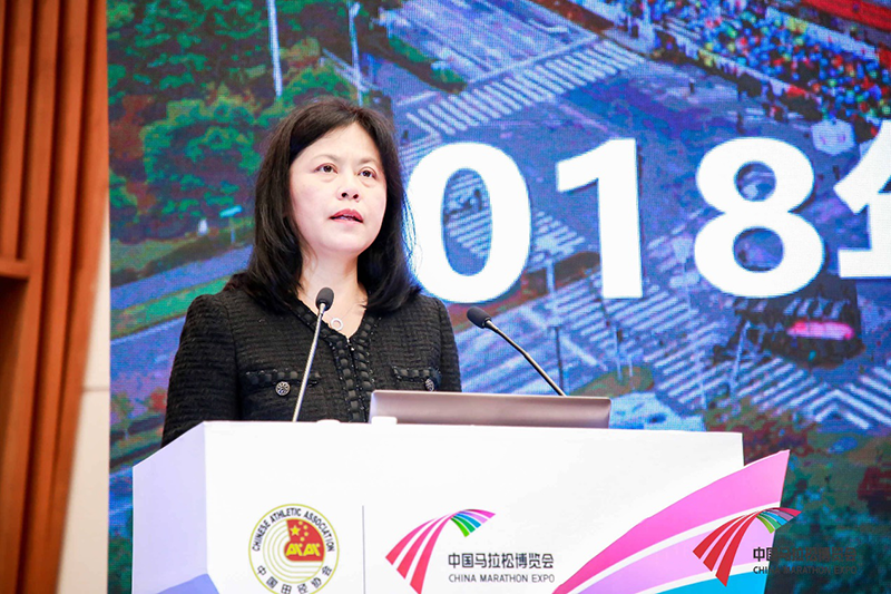▲ 國家體育總局田徑運動管理中心黨委書記、中國田徑協(xié)會副主席王楠女士發(fā)表“中國馬拉松 共創(chuàng)美好未來”的主題演講