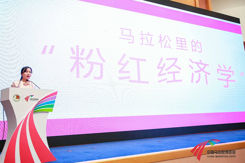 ▲女王跑創(chuàng)始人、江蘇蘇奧體育發(fā)展有限公司CEO崔傲雪女士為大家?guī)眍}為“馬拉松里的粉紅經(jīng)濟學”主題演講