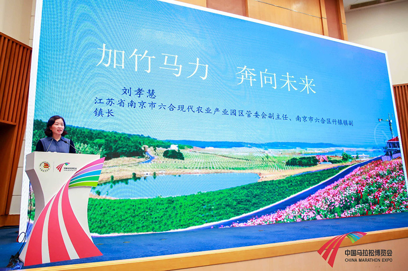 南京市六合區(qū)竹鎮(zhèn)鎮(zhèn),接下來有請江蘇省南京市六合現(xiàn)代農(nóng)業(yè)產(chǎn)業(yè)園區(qū)管委會副主任、南京市六合區(qū)竹鎮(zhèn)鎮(zhèn)副鎮(zhèn)長劉孝慧為大家?guī)眍}為加竹馬力,奔向未來的分享,劉孝慧通過竹鎮(zhèn)的2018、竹馬的歷史、體育+旅游的特色小鎮(zhèn)三個篇章,向大家推介了竹鎮(zhèn)和竹鎮(zhèn)馬拉松。