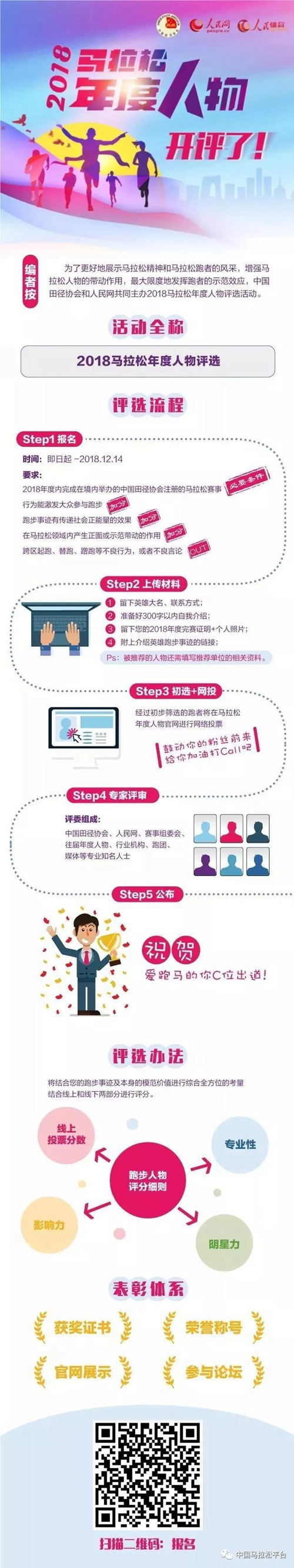 近年來,中國馬拉松運(yùn)動異軍突起,快速發(fā)展,也涌現(xiàn)了一批踐行和推動馬拉松運(yùn)動的代表人物。為了更好地傳播馬拉松精神、展現(xiàn)馬拉松跑者的風(fēng)采,最大限度地發(fā)揮跑者的示范效應(yīng),中國田徑協(xié)會和人民網(wǎng)共同主辦2018馬拉松年度人物評選活動,活動由人民體育承辦。