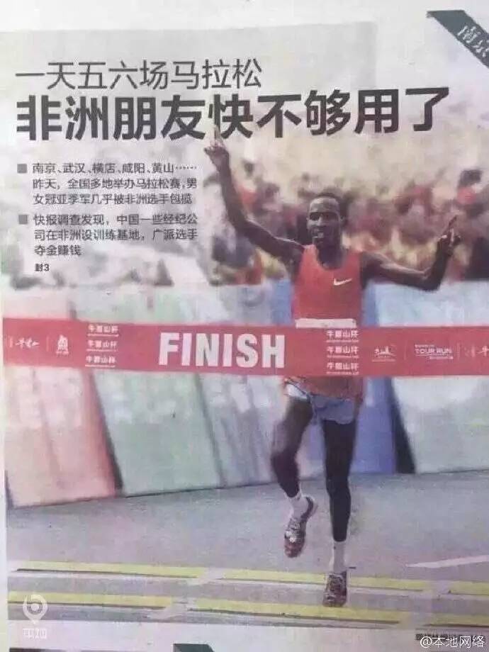 經(jīng)常參加馬拉松的跑友會發(fā)現(xiàn)這么一個(gè)有意思的現(xiàn)象:前面領(lǐng)跑及最終奪冠的選手,基本上都是黑人。據(jù)每日經(jīng)濟(jì)新聞記者了解,國內(nèi)各大馬拉松賽事,尤其要打造金標(biāo)賽事的城市馬拉松,主辦方都要邀請黑人參賽。