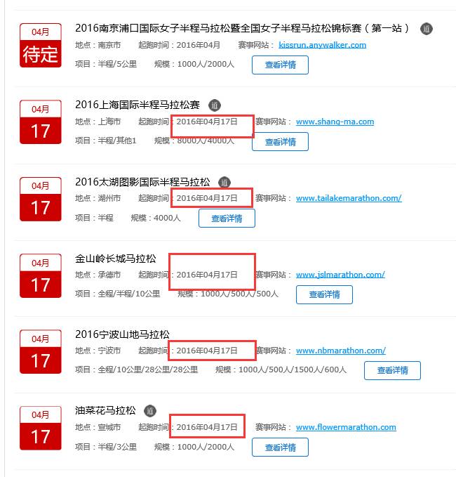 一天五六場馬拉松的說法,一點(diǎn)也不夸張,僅2016年3月27日一天,備案的大型馬拉松就有鄭開國際馬拉松賽、成都雙遣馬拉松賽、上海松江半程馬拉松賽、南京山地馬拉松賽、麗水半程馬拉松賽5場。