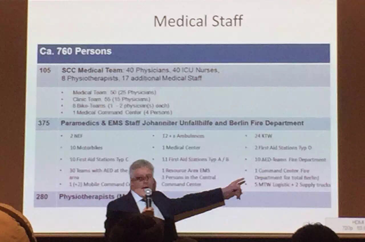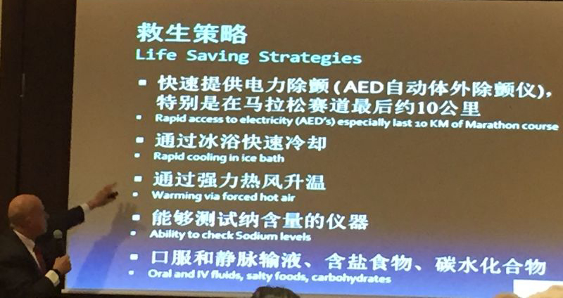 本次峰會特別邀請三位世界頂級馬拉松的首席醫(yī)療官——來自紐約的Stuart Weiss博士、來自東京的Hideharu Tanaka博士以及來自柏林的Lars Brechtel博士。會上,三位博士與參會的政府代表、保險公司以及體育賽事的安全保障方和合作方通過探討國際案例的方式,進行健康與安全領(lǐng)域的觀點與學識的交流分享,包括醫(yī)療支持系統(tǒng)(例如PAD)、醫(yī)療危機管理、馬拉松應急預案等等。